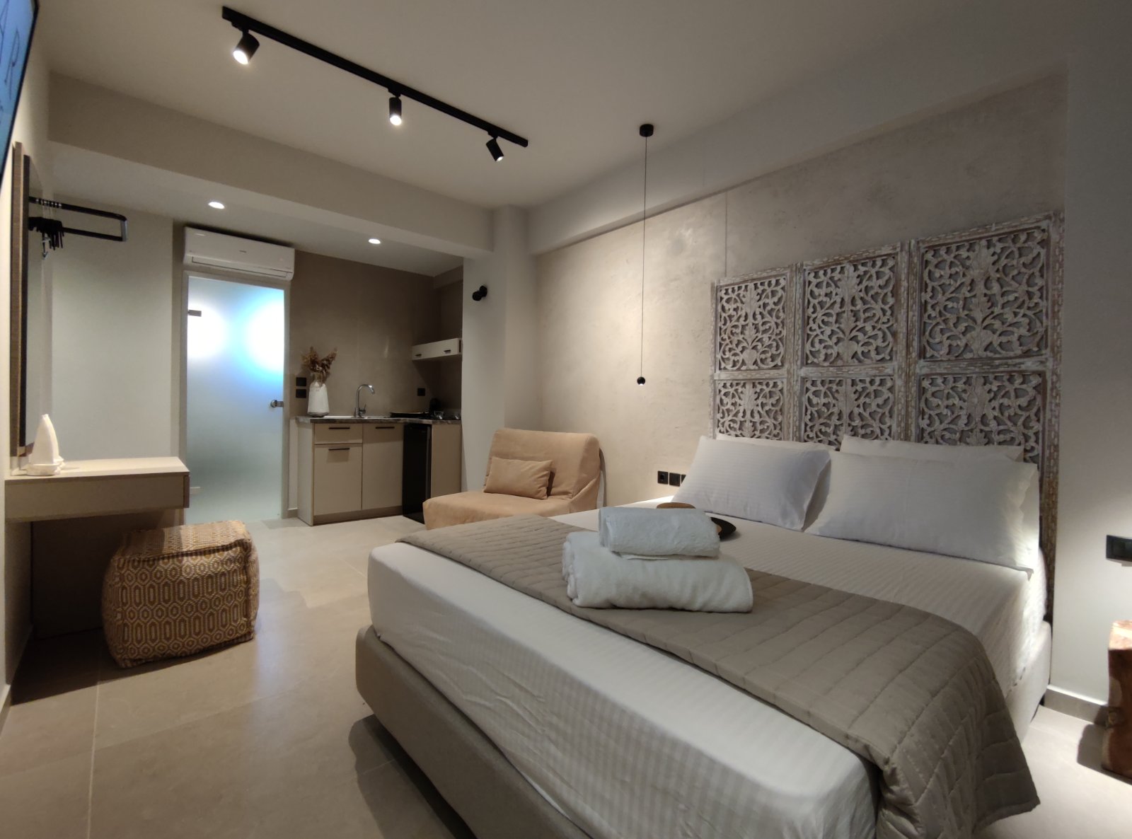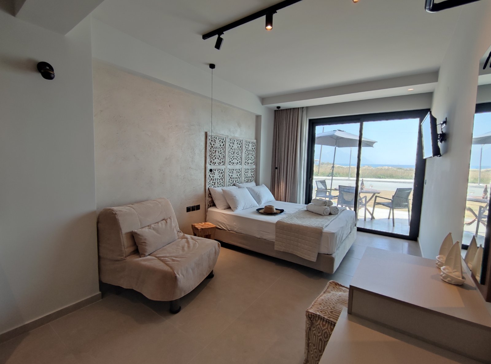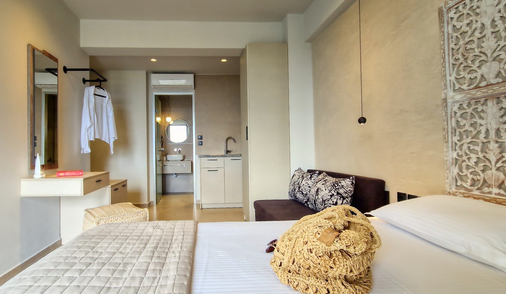 Κομψό μοντέρνο δωμάτιο ιδανικό για τρεις ενήλικες ή για οικογένεια με ένα παιδί. Προσφέρει μοναδική θέα και έχει απευθείας πρόσβαση στον κήπο